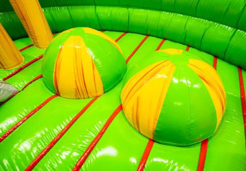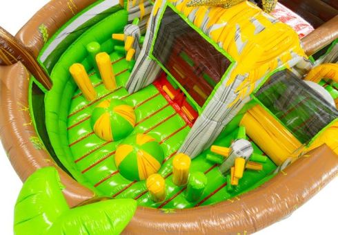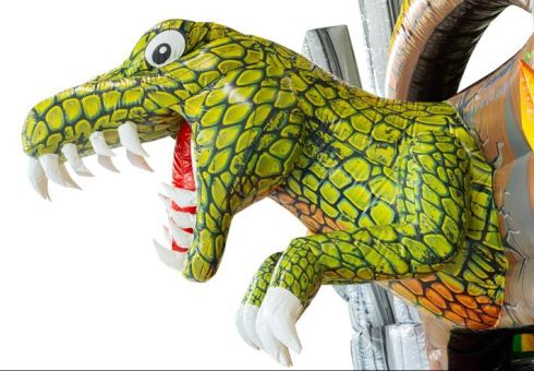 Die Hüpfburg ist als U‑förmiger Hindernisparcours konzipiert. Sie bietet allen Nutzern deutlich mehr Spielspaß als ein klassisches Hüpfkissen. Die Teilnehmer können hier klettern, springen, Hindernisse überwinden und über eine Rutsche wieder nach unten sausen. Das detailreiche Design mit 3D‑Dinosauriern und Vulkan‑Elementen in kräftigen Farben sorgt für maximale Aufmerksamkeit und ein intensives Spielerlebnis.